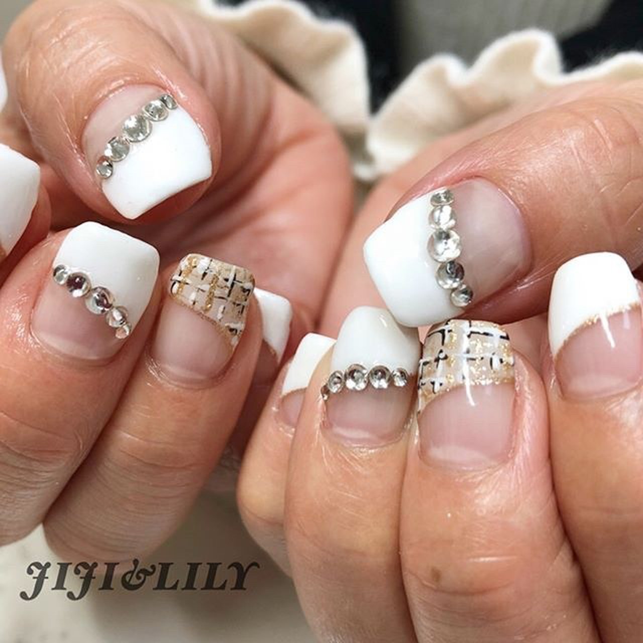 秋 冬 ハンド 変形フレンチ ビジュー ジジ リリーのネイルデザイン No ネイルブック