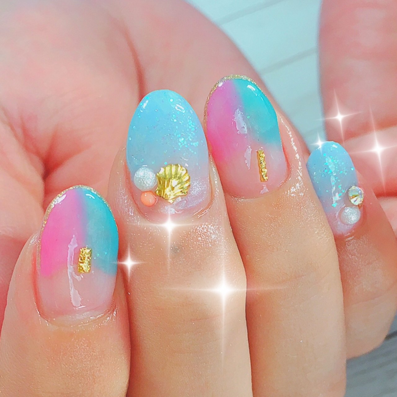 マーメイド風ネイル透明感のある水色とピンクのグラデーションに貝殻とヒトデの海の中アート 参宮橋 代々木 北参道 ネイルサロン Aira Nail アイラネイル